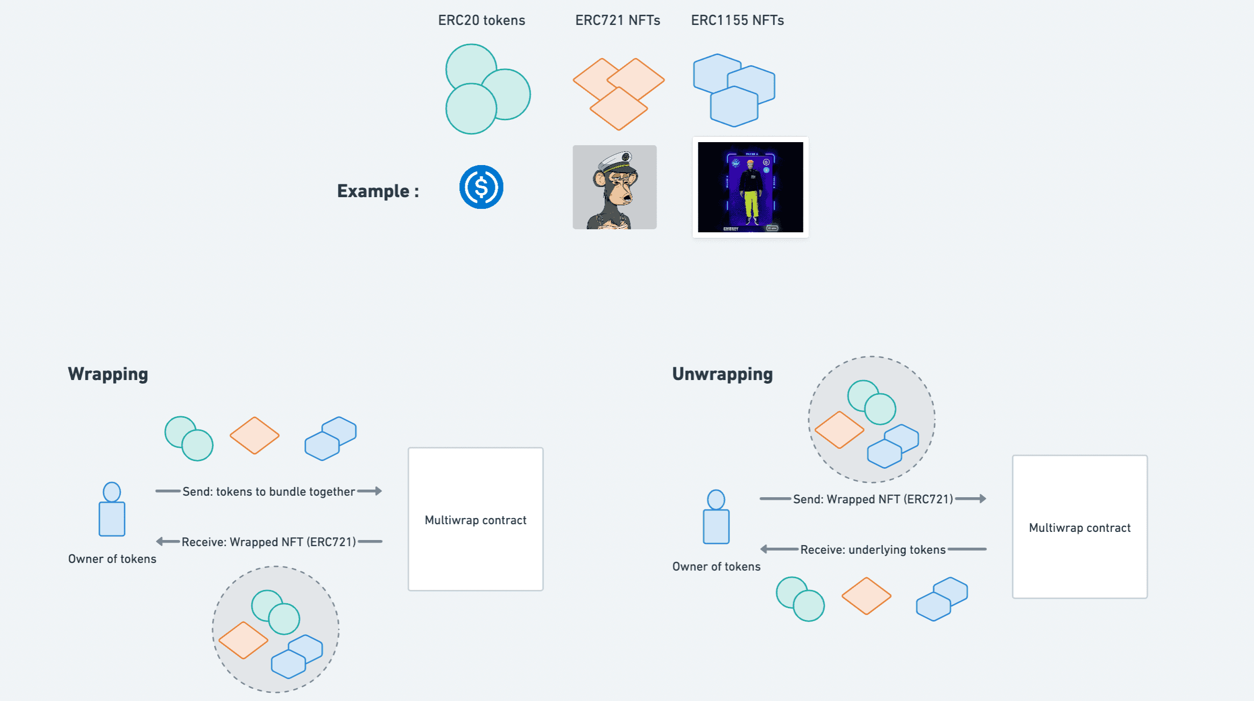 The Multiwrap contract is meant to be used for bundling up multiple assets (ERC20 / ERC721 / ERC1155) into a single wrapped token, which can then be unwrapped in exchange for the underlying tokens.
